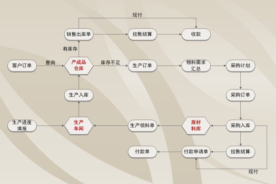 生產(chǎn)管理主要管理由客戶訂單下達生產(chǎn)計劃、生產(chǎn)車間領(lǐng)料、生產(chǎn)工序交接、生產(chǎn)進度填報、生產(chǎn)退料、生產(chǎn)入庫等。