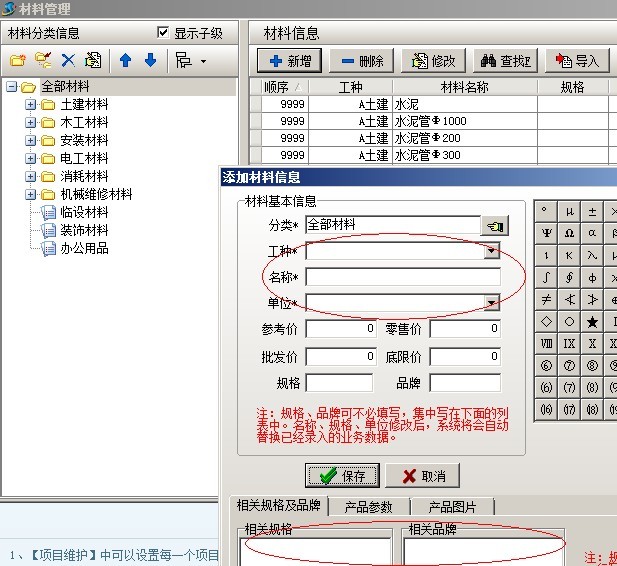 首先注意的是,不要把固定設備期初統計、材料庫存統計與基礎信息中設備維護、材料維護混淆。其中設備維護和材料維護記錄的是設備、材料的名稱、規格、品牌、所屬工種、分類等基本信息。如下圖: