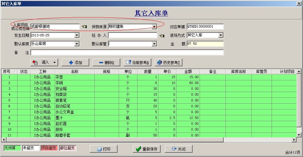 材料庫存通過其他入庫單來錄入庫存數量。如下圖:
