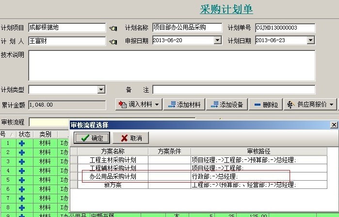 方案設置完成后,用戶在創建單據的時候根據不同的情況就可以選擇不同的方案,例如:如果公司行政部要采購辦公用品,那么他們在做采購計劃單的時候,審核方案就可以選擇辦公用品方案。如下圖: