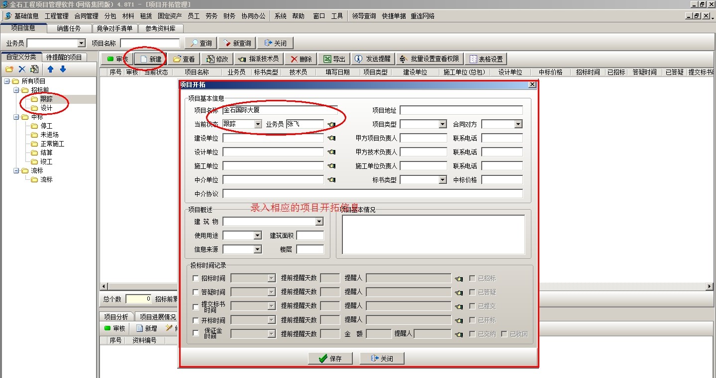 1、項目立項后,首先到【項目開拓】新建項目,注意選擇項目相應(yīng)的狀態(tài)(必須為招標前),然后錄入項目的基本信息,如下圖: