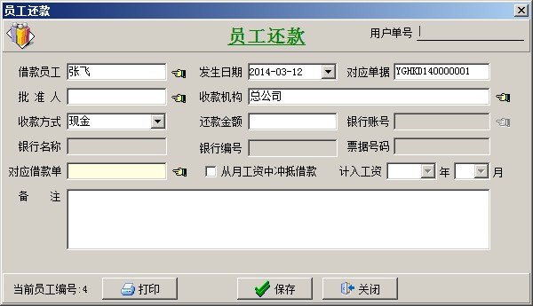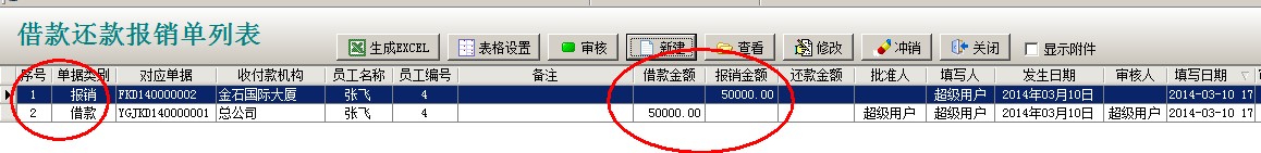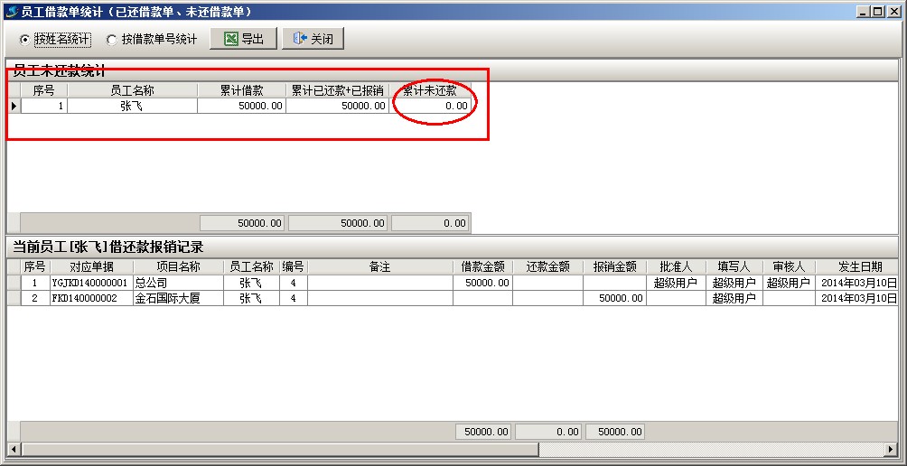 借還款單列表中2個單據,一個是業務員(張飛)的借款,另一個報銷還款單據,兩個單據抵消,業務員(張飛)就沒有欠款。還可以通過員工借款單統計查詢,財務管理模塊------相關查詢-----員工借款單統計。